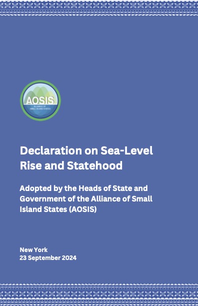 PREAMBLE 1. Recalling that Small Island Developing States (SIDS) have been sounding the alarm on sea level rise for many decades, collectively beginning with the Malé Declaration on Global Warming and Sea Level Rise adopted in Maldives in November 1989, 2. Recalling also that SIDS as oceanic States, countries and territories place great value on our ocean, seabed, and land, and cherish their deep connection to our communities, natural environment, resources, lives, livelihoods, identities, culture, and traditional knowledge, 3. Underlining that SIDS are disproportionately impacted and specially affected by climate change-related sea-level rise, 4. Recognising that the serious and irreversible threats and adverse impacts of climate change-related sea-level rise are a global crisis that will disproportionately imperil the lives, livelihoods, food security, ecosystems, and wellbeing of SIDS’ peoples and communities, 5. Reaffirming our 2021 AOSIS Leaders Declaration, which affirms that our maritime zones, as established and notified to the Secretary-General of the United Nations in accordance with the United Nations Convention on the Law of the Sea, and the rights and entitlements that flow from them, shall continue to apply, without reduction, notwithstanding any physical changes connected to climate change-related sea-level rise, 6. Recognising that under international law there is a principle that a State, once established, will continue to exist and endure, and maintain its status and effectiveness, and that international law does not contemplate the demise of statehood in the context of climate change-related sea-level rise, 7. Further recognising that continuity of statehood in the face of climate change-related sea-level rise is consistent with important principles and rights of international law, including the right of peoples to self-determination, the right to a nationality, the protection of territorial integrity and political independence, principles of equity and fairness, the maintenance of international peace and security which in turn requires stability in international relations, the right of a state to provide for its preservation, the duty of cooperation, the sovereign equality of states, and permanent sovereignty over natural resources, 8. Acknowledging that international cooperation, including through the provision of technical, financial or other support, will be required to protect persons and communities affected by climate change-related sea level rise including, inter alia, protecting their culture, cultural heritage, identity and dignity, and meeting their essential needs, 9. Further acknowledging that States have an important duty in ensuring protection of their people, and continuity of statehood is necessary and fundamental for that protection to be implemented, WE, THE HEADS OF STATE AND GOVERNMENT OF THE ALLIANCE OF SMALL ISLAND STATES, THEREFORE: 1. Declare that international law is premised on a principle of continuity of statehood, consistent with broad state practice over the past century, 2. Affirm that consistent with the principles of equity, fairness and sovereign equality of states, statehood cannot be challenged under any circumstances of climate change-related sea-level rise, 3. Declare that the statehood and sovereignty of SIDS and our membership in the United Nations, its specialized agencies and other intergovernmental organizations will continue, and the rights and duties inherent thereto will be maintained, notwithstanding the impacts of climate change-related sea-level rise, 4. Also declare that consistent with the right to self-determination, the statehood and sovereignty of SIDS and our membership in the United Nations, its specialized agencies and other intergovernmental organizations will cease only if another form of expression of the right to self-determination of a SIDS population is explicitly sought and freely exercised by that population, and 5. Call upon the international community, consistent with the duty to cooperate, to support this Declaration and cooperate in achieving its purposes. AGREED at New York, 23 September 2024